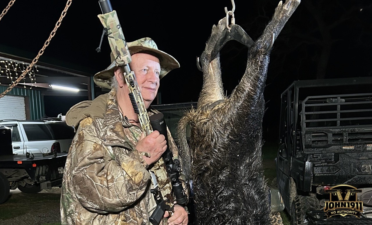 Doc is making his way back east from his winter in Arizona. As usual, he stops in Texas for his annual pig hunt. Here is his first kill. Shot with a 6.5 Creedmoor. -editor